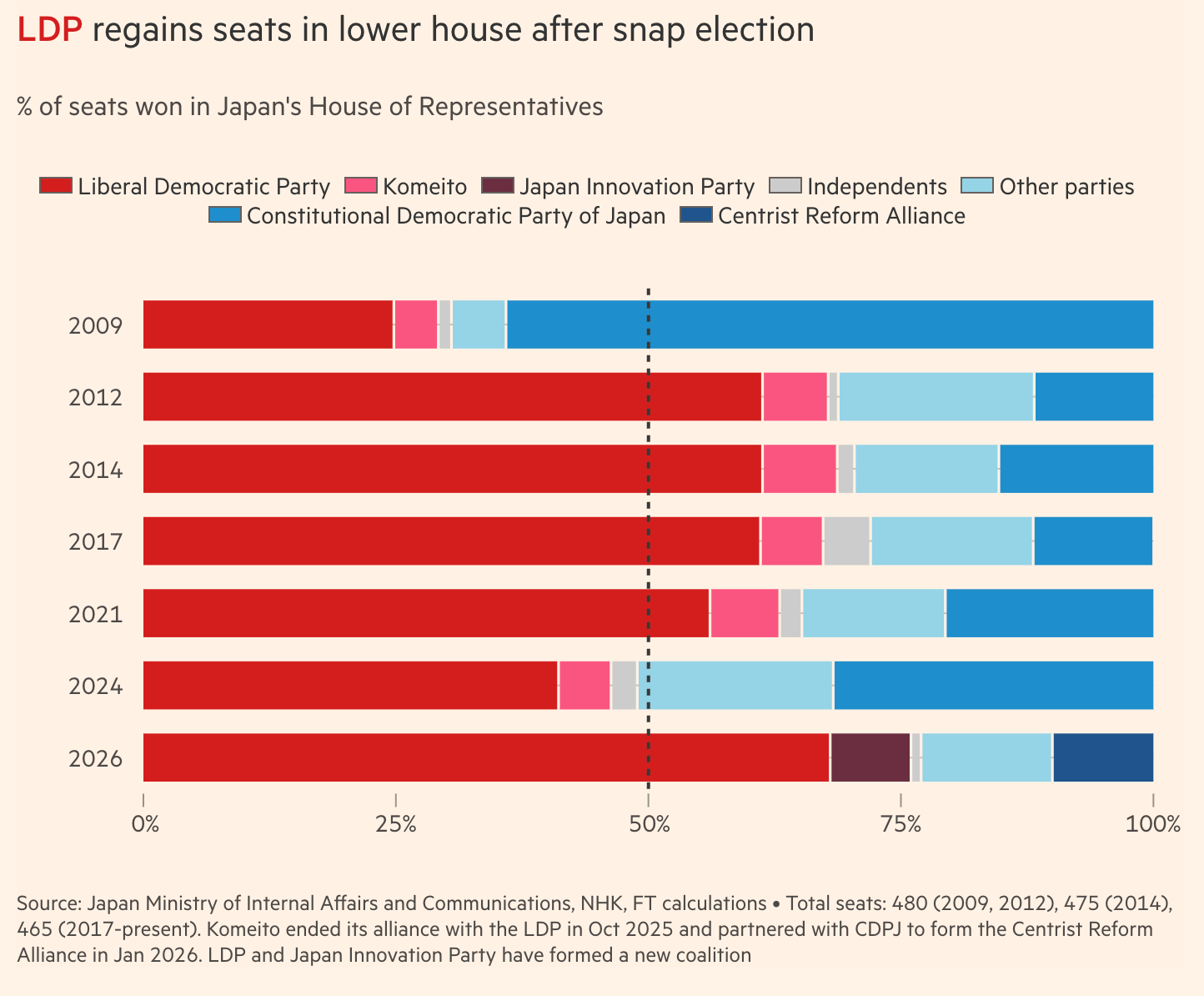 Joining these initial observations together: election results across the globe in 2024 - including in Japan - strongly suggested inflation led to incumbent parties losing votes and often ceding power. Japan is continuing to experience economic stress, especially in its most important staple, rice. Given this, one might have expected Prime Minister Sanae Takaichi and the governing LDP to again be punished, as it was in elections in 2024 and 2025. Quite the opposite happened, however, with a remarkable victory for the LDP, as this FT chart illustrates:
