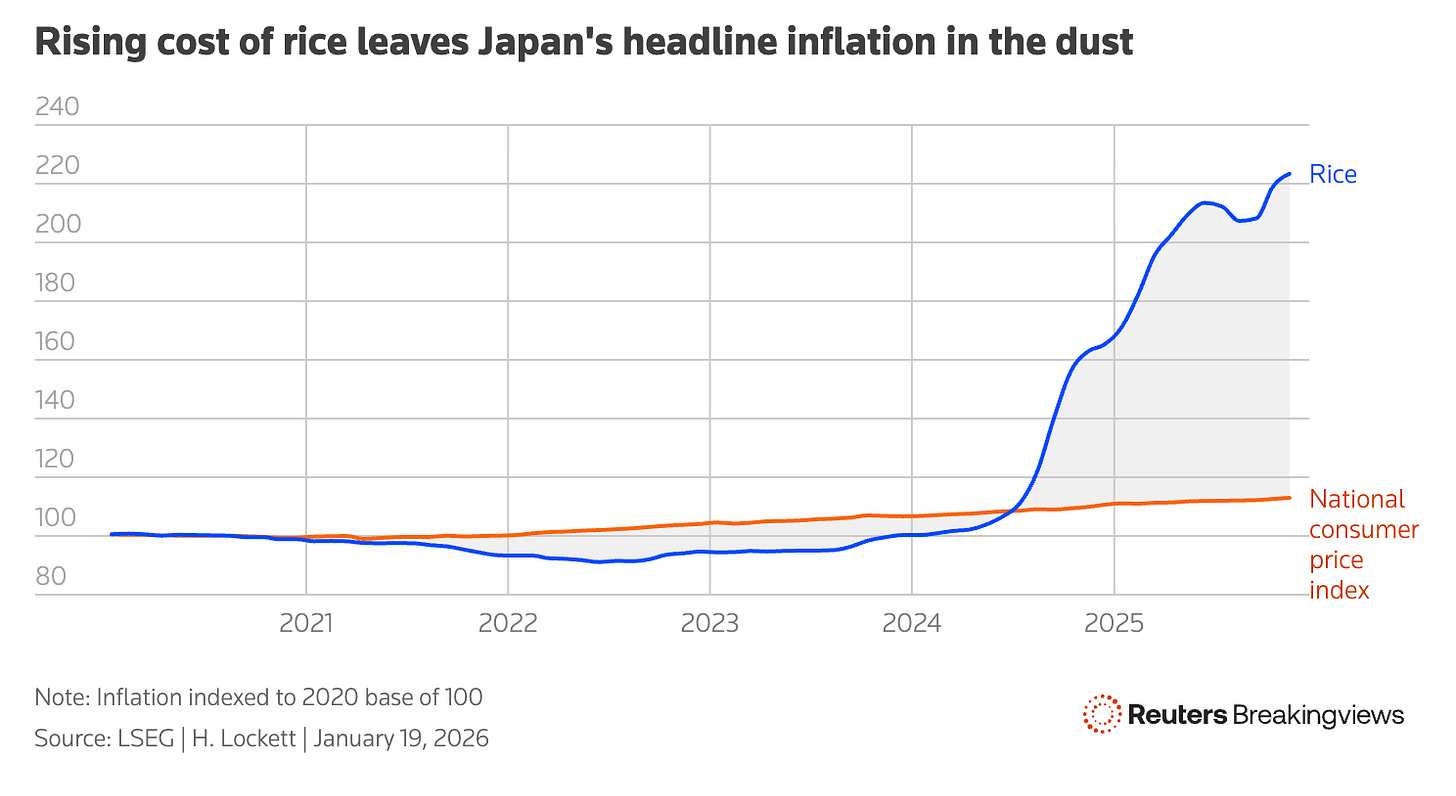 Japan has hardly been alone in experiencing inflation, but its arrival and persistence after decades of deflation and price stability has had a very noticeable impact. It is keenly felt. It is also important to zoom in on one item - rice - where a cocktail of bad policy, misaligned incentives and climate change has resulted in a significant surge in price, as this Reuters chart illustrates: