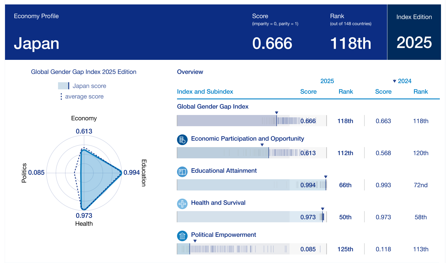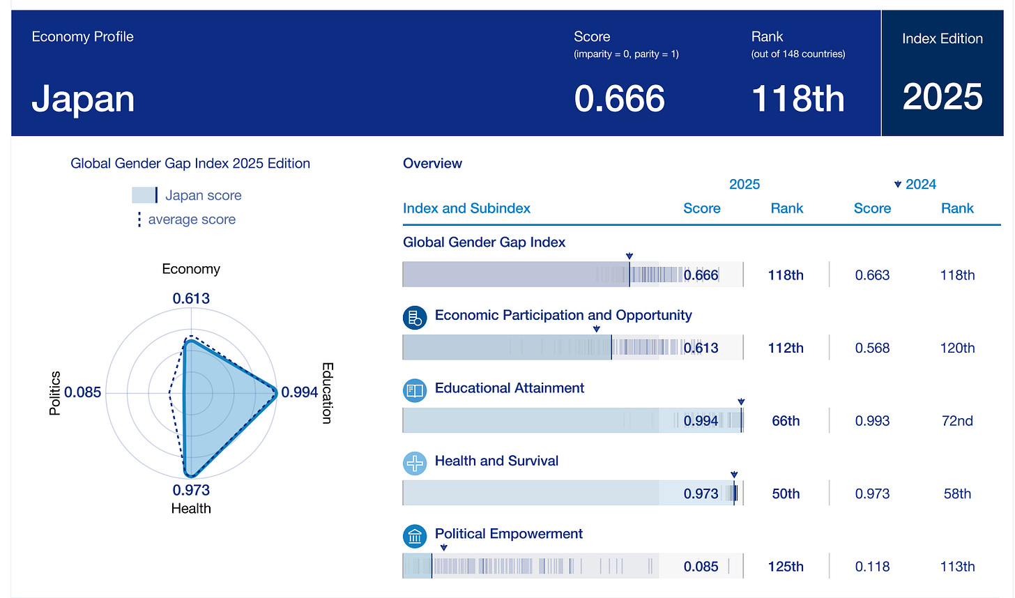 A final point about Takaichi’s appeal. Last October when Takaichi was voted in as the 104th prime minister of Japan, she became the first woman to hold this role. For some context, consider Japan’s position in the WEF’s Global Gender Gap Report 2025, which could be summarised as ‘not good’: